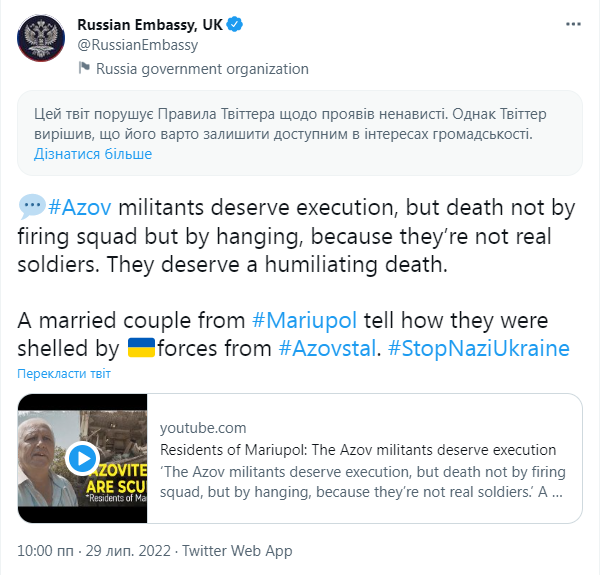Twitter приховав це повідомлення на сторінці рашистських дипломатів, зазначивши: "Цей твіт порушує Правила Твіттера щодо проявів ненависті".Однак доступ до твіту все ж залишається "в інтересах громадськості«.У МЗС України відреагували на публічні заклик посольства РФ до страти бійців полку «Азов». Як зазначив речник МЗС України Олег Ніколенко, це не відрізняє російських дипломатів від військових їхньої країни, вони мають відповісти за свої злочини.
