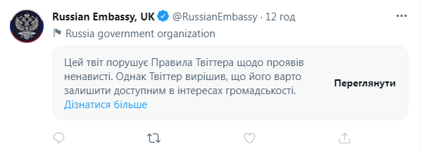 Заяву про це зробило у Twitter посольство країни-агресора у Великій Британії, передає Главком.