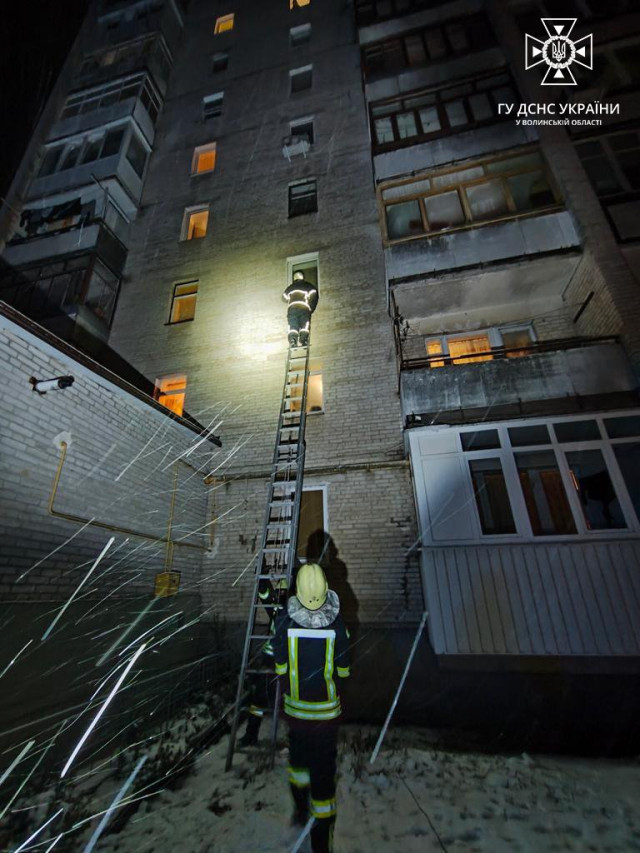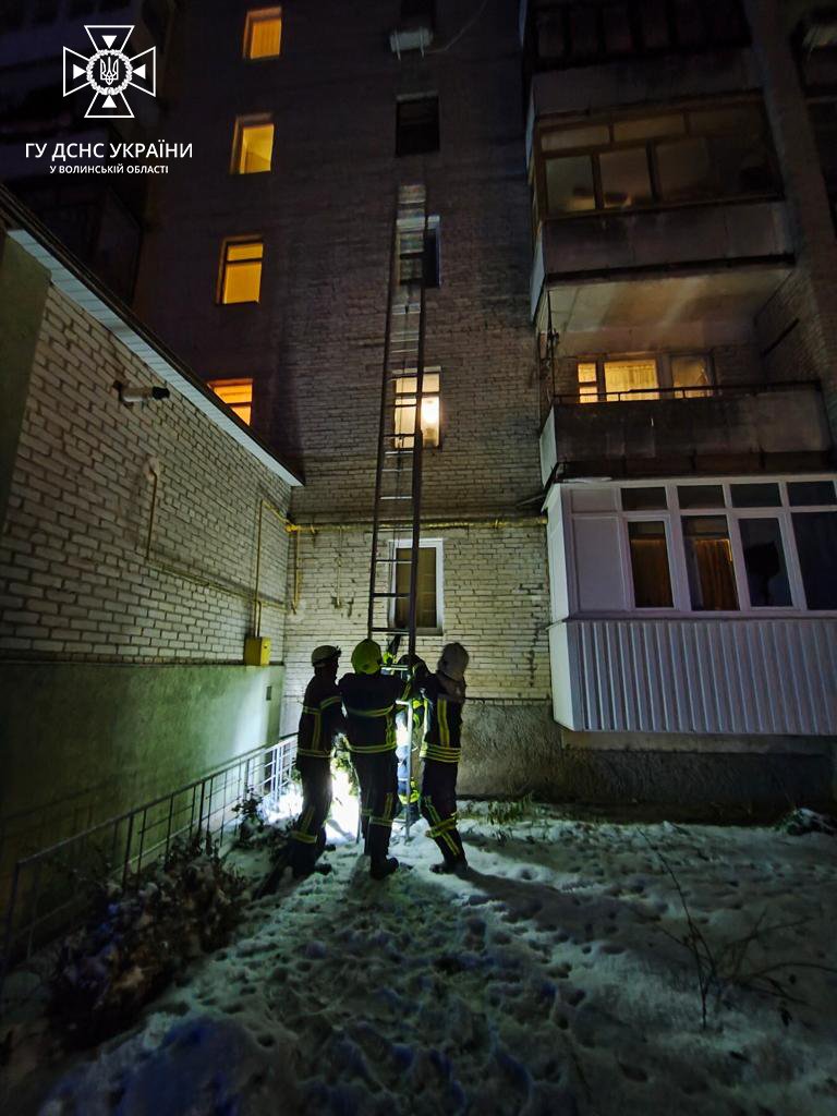 По прибуттю на виклик рятувальники луцької 2-ї державної пожежно-рятувальної частини та аварійно-рятувального загону спеціального призначення за допомогою трьохколінної висувної драбини дістались у квартиру через вікно третього поверху та виявили на підлозі жінку поважного віку.