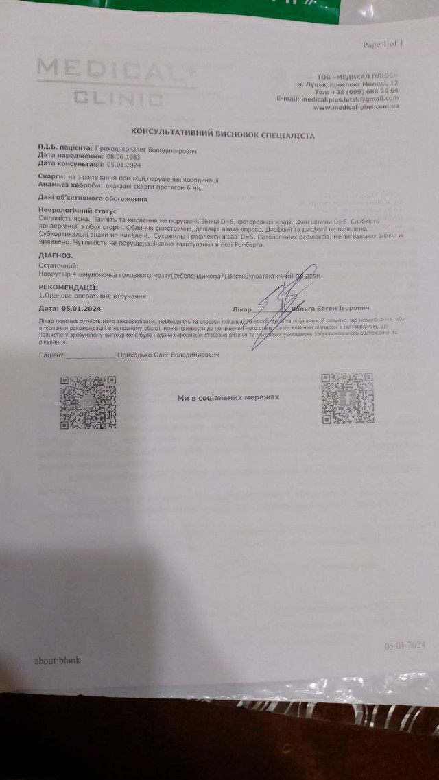 У січні в лучанина Приходька Олега виявили новоутворення 4 шлуночка головного мозку. Відтоді чоловік пройшов низку обстежень та консультацій, висновок такий – необхідна термінова операція.