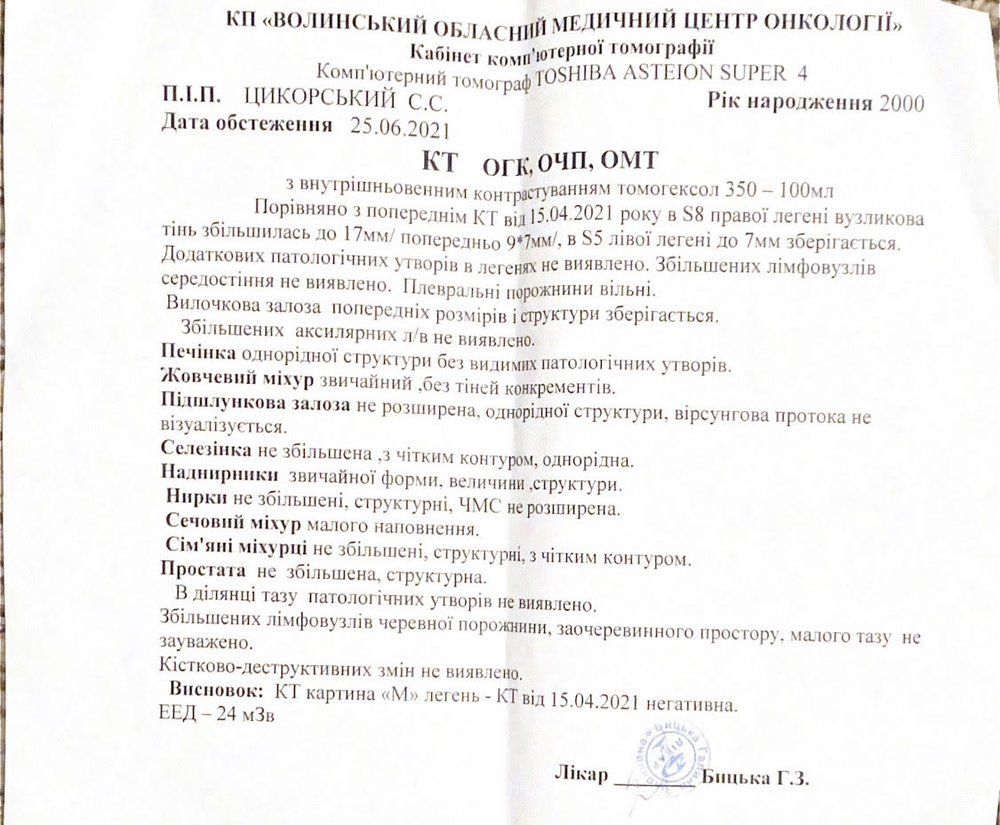 «Я благаю про допомогу всіх небайдужих людей, і я дуже сильно сподіваюся, що ви не залишитеся осторонь моєї біди. На даний момент у мене в житті склалася дуже важка ситуація, яку я вже просто фізично і фінансово не можу вирішити. У мене рецидив в легенях. Оскільки після останнього КТ я не міг працювати, бо, згідно із рекомендацією лікарів, відновлював свій організм більше трьох місяців. У 2018-му році у мене виявили саркому м’яких тканин з метастазами в легенях 4-го ступеня. Перед операцією я пройшов дві хімії, метастази зникли і в 2019-му році мені зробили операцію на м’яз. Після цього я пройшов ще три хімії... Все начебто добре. Живу, радію... Але з 25 червня метастази збільшились, і треба робити операцію, яку я так намагався уникнути, бо 100 % ніхто не дає, що хвороба не повернеться, але я вірю що це останній мій етап в боротьбі з раком», – каже Семен.Результати КТ 25 червня 2021 рокуРеквізити для допомоги: