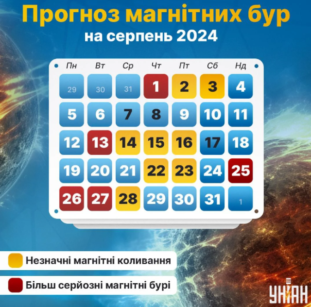 Серпень одразу починається з магнітної бурі. Підвищену сонячну активність очікують з 1 по 3 серпня. 1 числа сила бурі становитиме 6 балів, а в наступні два дні знизиться до 4 балів.