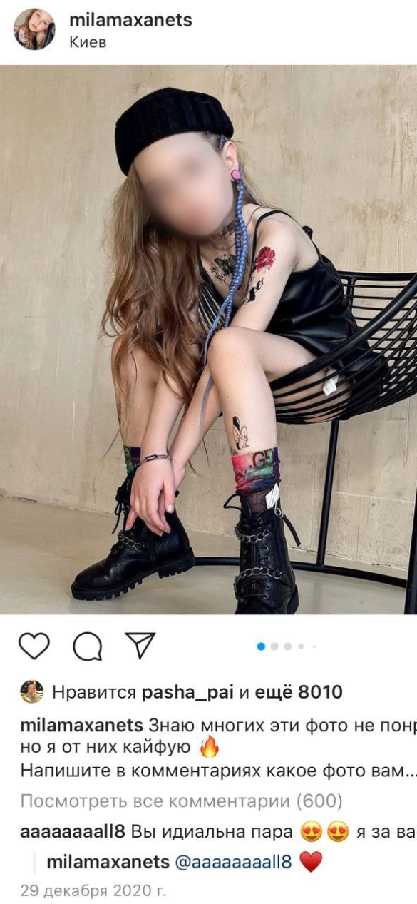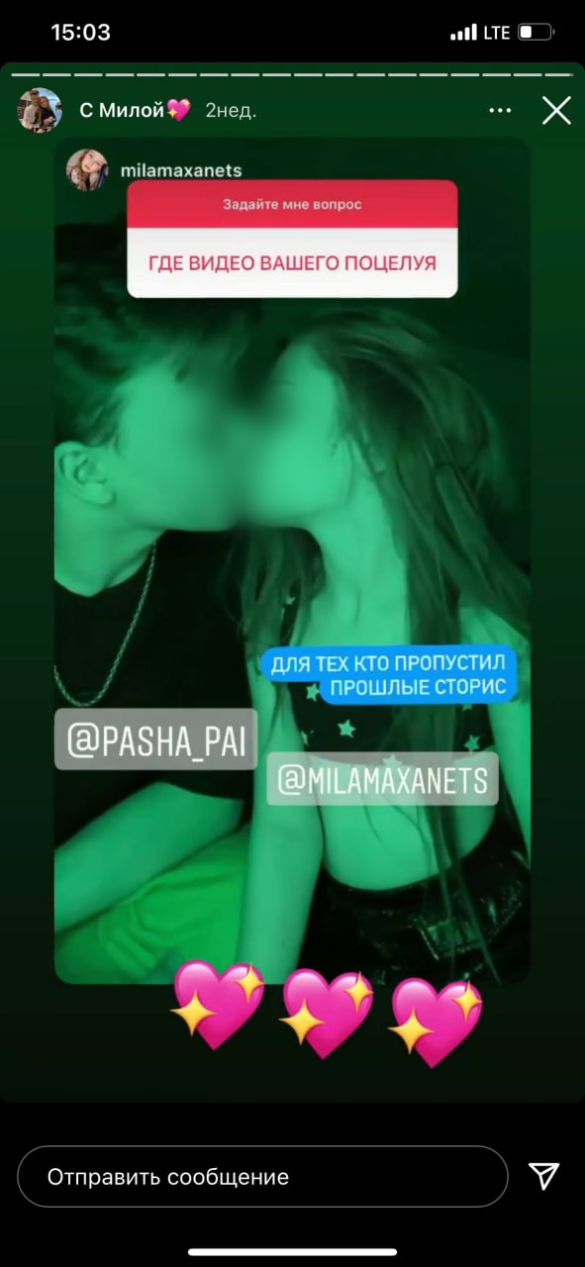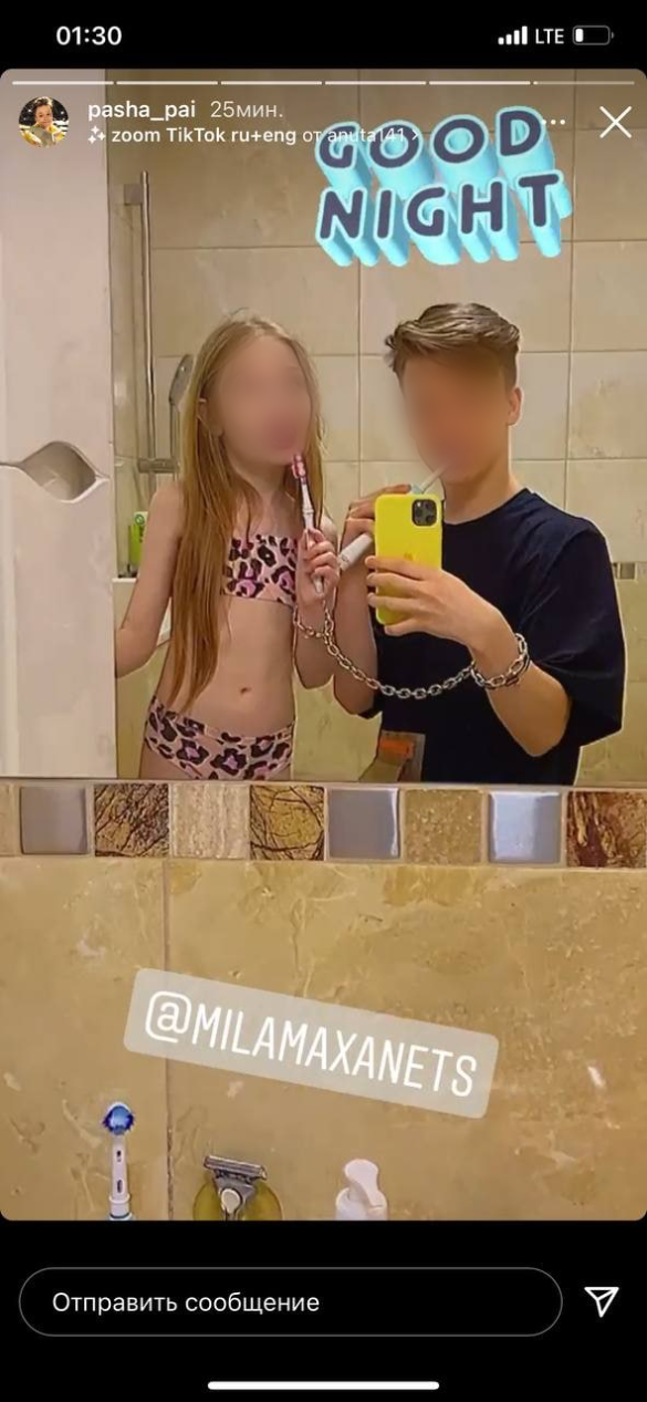 «Ми почали зустрічатися з Пашею. Так, це правда», – написала Міла.Далі послідували світлини поцілунків дітей, обіймів та навіть спання разом.Світлини дітей разом збурили громадськість. Більшість вважає, що такі стосунки неприпустимі для дівчинки такого віку.
