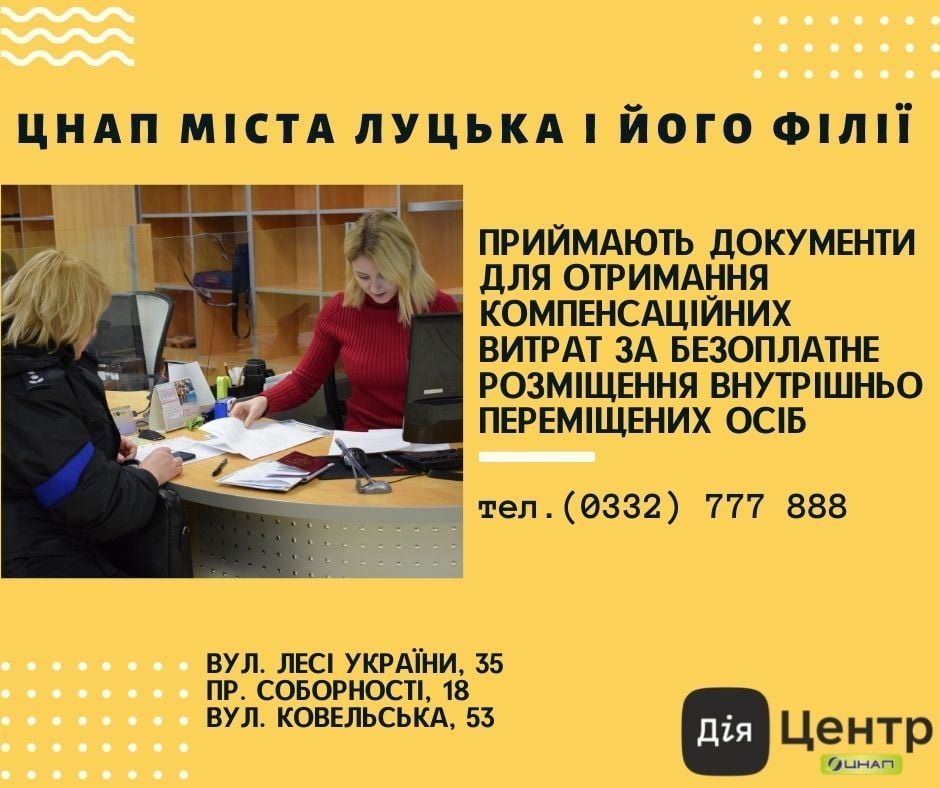 До уваги тих, хто безоплатно прихистив внутрішньо переміщених громадян у ЦНАП міста Луцька (вул. Лесі України, 35) та його філіях (пр. Соборності, 18, вул. Ковельська, 53) можна подати документи для отримання компенсаційних витрат за розміщення наших співвітчизників, які в умовах воєнного стану вимушено покинули власні домівки.