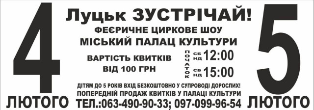 Вперше до Луцька приїде Київський державний цирк «Вогні Києва». Чотири феєричні, видовищні та захоплюючі вистави цирк покаже на сцені Палацу культури.