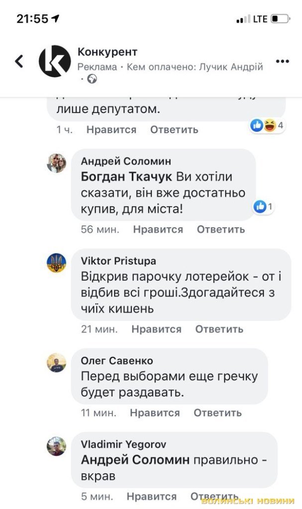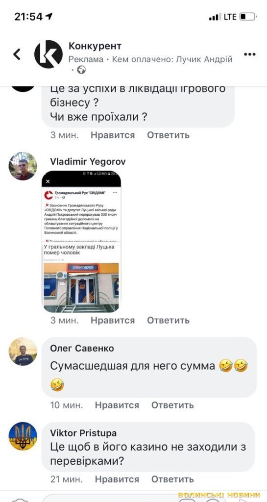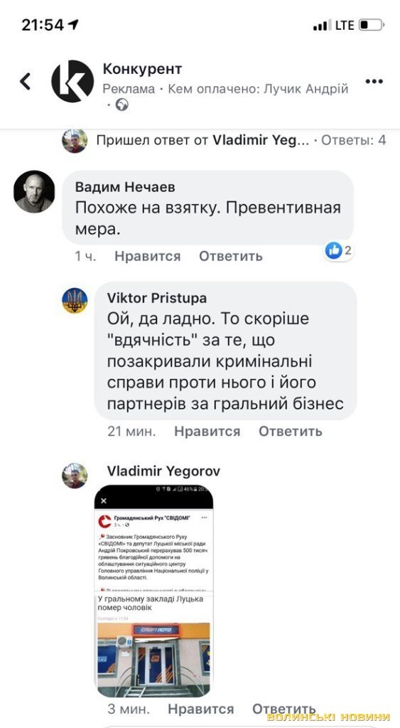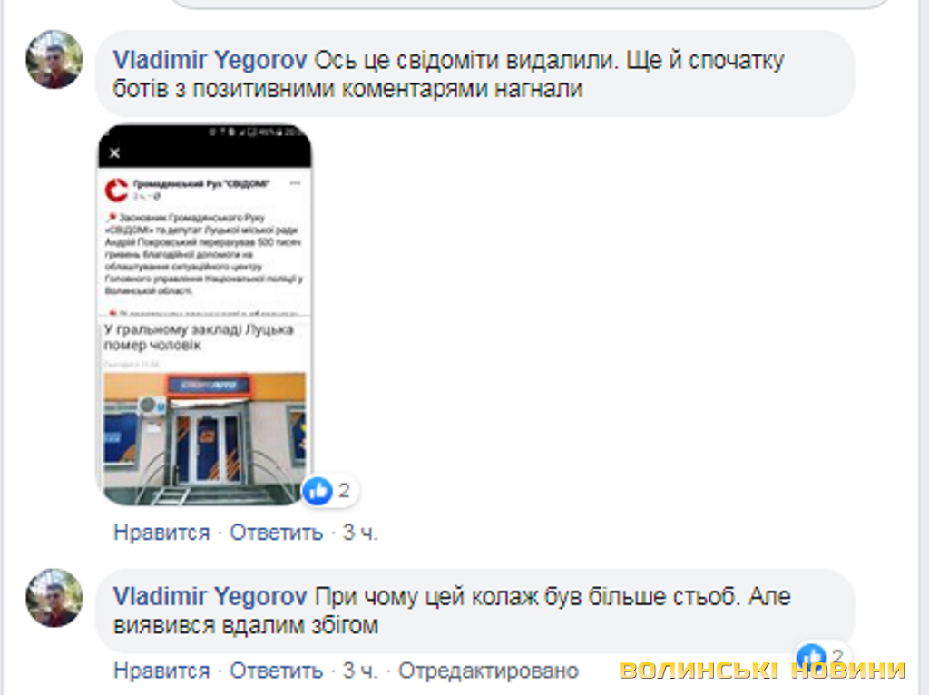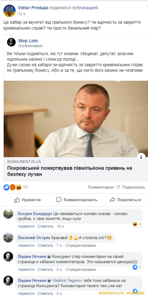 Зауважимо, такі висловлювання очевидно не сподобалися адміністраторам фейсбук-сторінки, оскільки вже наступного ранку багатьох коментарів під постом з цією новиною уже не було. Залишилися лише позитивні та нейтральні відгуки про діяльність Андрія Покровського.З вищесказаного можна зробити висновок, що несприйняття критики в оточенні депутата вилилося в цензуру. Варто додати, уже декілька незалежних джерел повідомляють, що Андрій Покровський всерйоз планує штурмувати столицю – луцький депутат хоче балотуватися до Верховної Ради від Луцька на осінніх парламентських виборах. Тож подарунок волинській поліції може бути лише початком сезону посівання електорального поля зі щедрої кишені бізнесмена, пов'язаного з нелегальним гральним бізнесом.