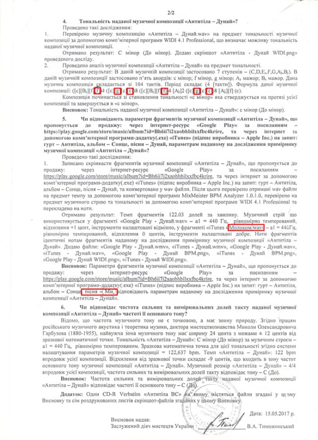 «Висновок, що три композиції гурту Антитіла – «Молоком», «Все красиво» та «Дунай» – відповідають параметрам, які запатентовані громадянином Лапковським, і тим самим порушують його патент, зробив Віктор Тиможинський. Він є головою предметно-циклової комісії теорії музики Волинського державного училища культури і мистецтв імені І.Ф. Стравінського», – повідомили напередодні на сторінці гурту.