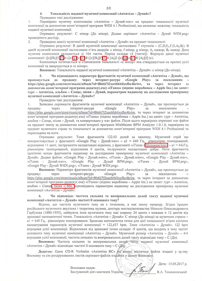 «Висновок, що три композиції гурту Антитіла – «Молоком», «Все красиво» та «Дунай» – відповідають параметрам, які запатентовані громадянином Лапковським, і тим самим порушують його патент, зробив Віктор Тиможинський. Він є головою предметно-циклової комісії теорії музики Волинського державного училища культури і мистецтв імені І.Ф. Стравінського», – повідомили напередодні на сторінці гурту.