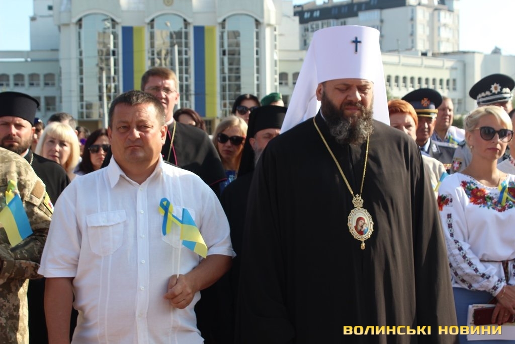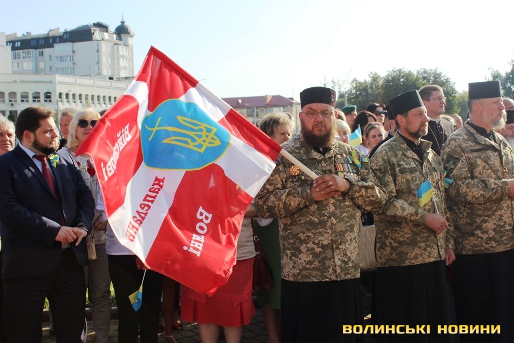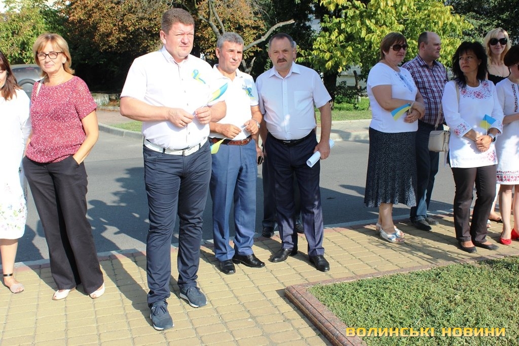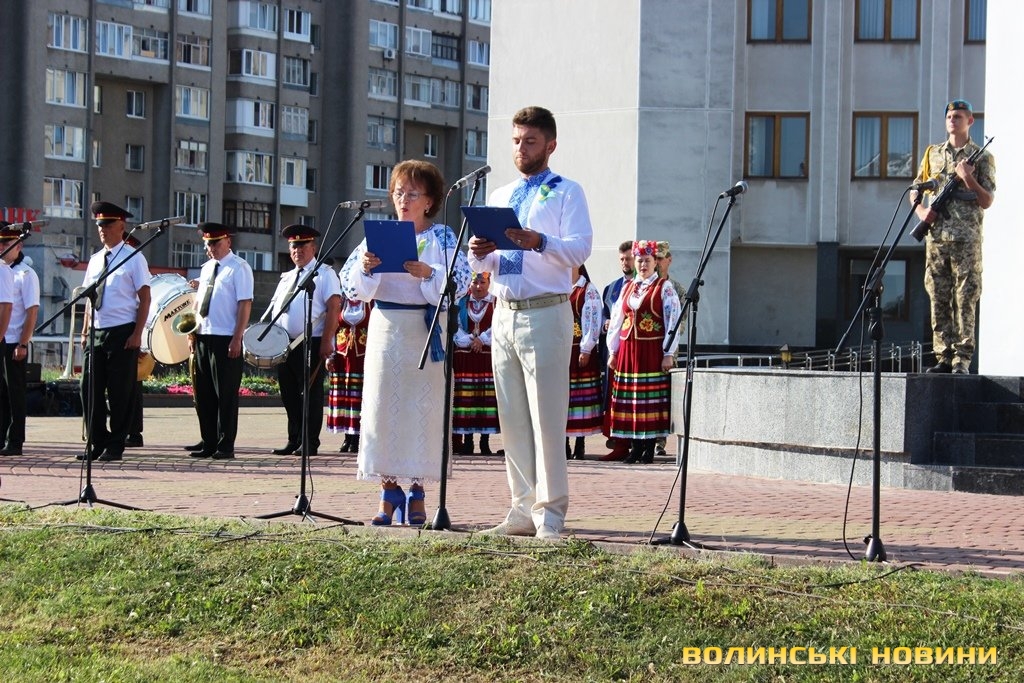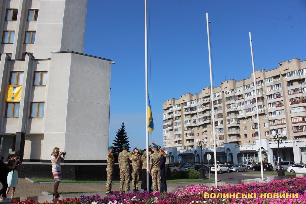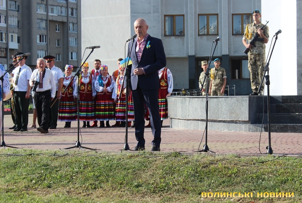 Далі з вітальним словом виступив голова Волинської ОДА Олександр Савченко, який побажав усім любити Україну, спілкуватися державною мовою та розбудовувати могутню країну починаючи з себе.«У нас славетна історія і наш український прапор діти та прадіди гордо несли вперед до перемоги. Були й часи, коли його таємно передавали з рук у руки, дбаючи про нього й вірячи, що він замайорить над Батьківщиною. Нині настали часи, коли знову за Прапор гинуть, з ним ховають та з ним ідуть відстоювати незалежність. Ми вчергове підтверджуємо, що Україна – нескорена, вона йде до перемоги. Піднімаючи сьогодні Прапор, ми розуміємо, що це наша святиня, на якій є кров наших братів, батьків та сестер і з ним ми день у день крок за кроком витісняємо ворога з рідної землі.
