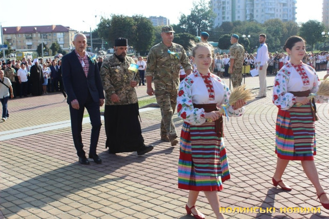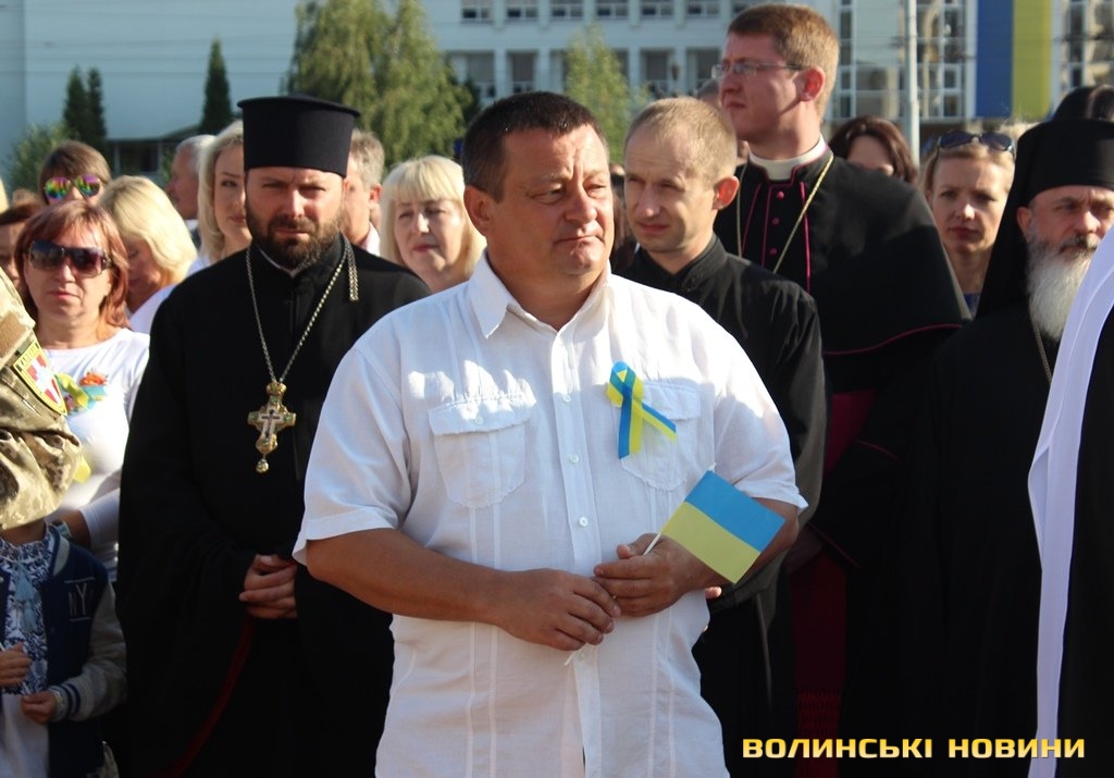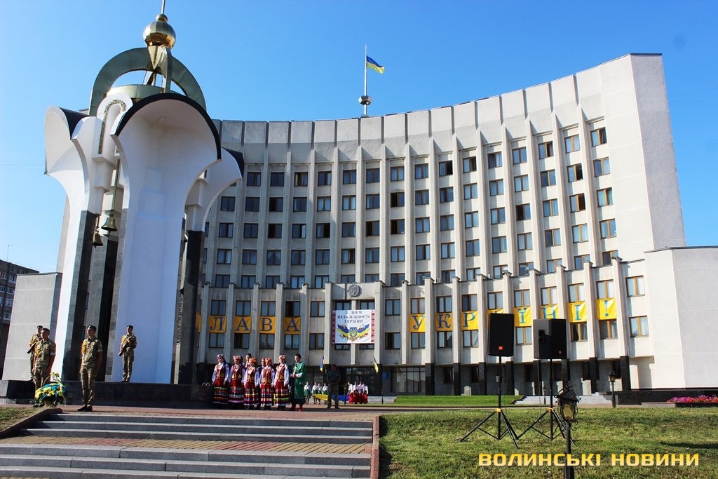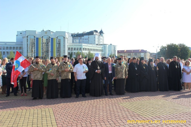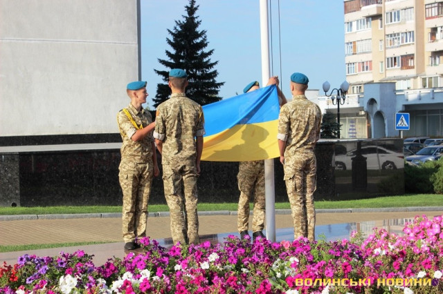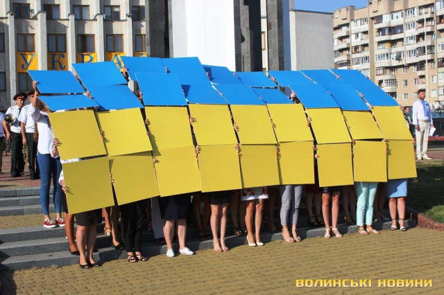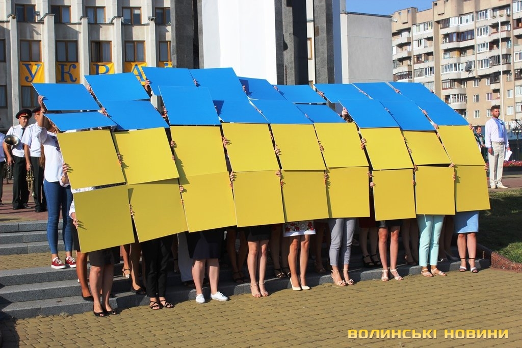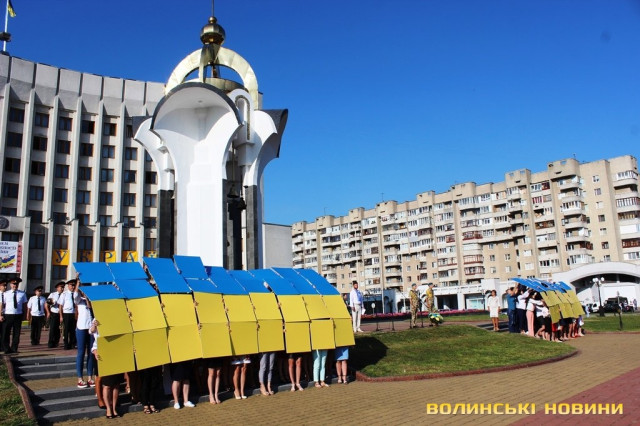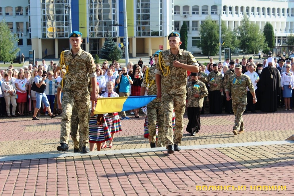 Далі з вітальним словом виступив голова Волинської ОДА Олександр Савченко, який побажав усім любити Україну, спілкуватися державною мовою та розбудовувати могутню країну починаючи з себе.«У нас славетна історія і наш український прапор діти та прадіди гордо несли вперед до перемоги. Були й часи, коли його таємно передавали з рук у руки, дбаючи про нього й вірячи, що він замайорить над Батьківщиною. Нині настали часи, коли знову за Прапор гинуть, з ним ховають та з ним ідуть відстоювати незалежність. Ми вчергове підтверджуємо, що Україна – нескорена, вона йде до перемоги. Піднімаючи сьогодні Прапор, ми розуміємо, що це наша святиня, на якій є кров наших братів, батьків та сестер і з ним ми день у день крок за кроком витісняємо ворога з рідної землі.