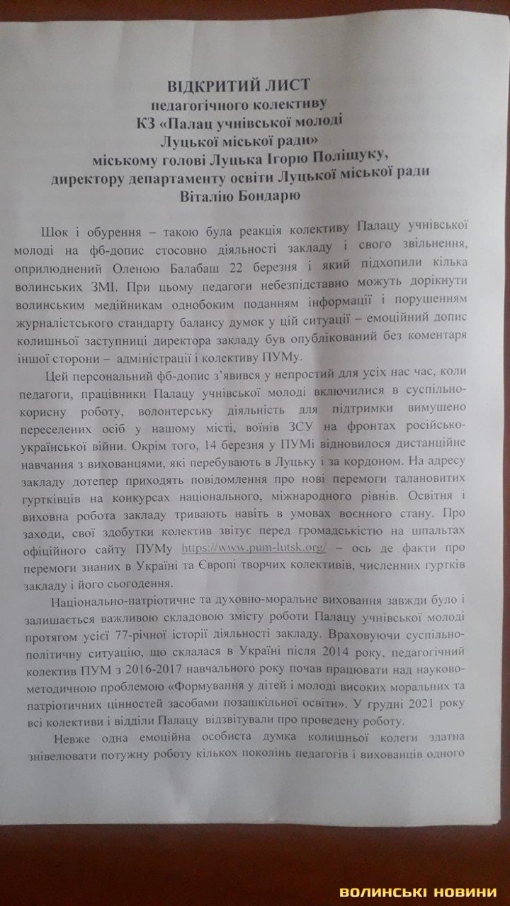 Понад 60 педагогів, які працюють у луцькому Палаці учнівської молоді, підписали відкритий лист на адресу міського голови та керівника департаменту освіти. У документі вони висловлюють обурення у відповідь на інформацію звільненої колишньої заступниці директора закладу.