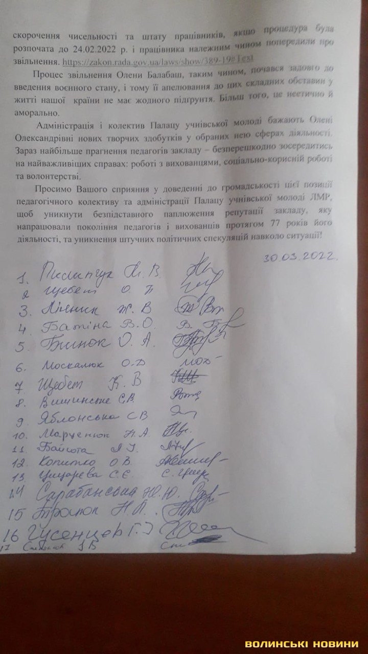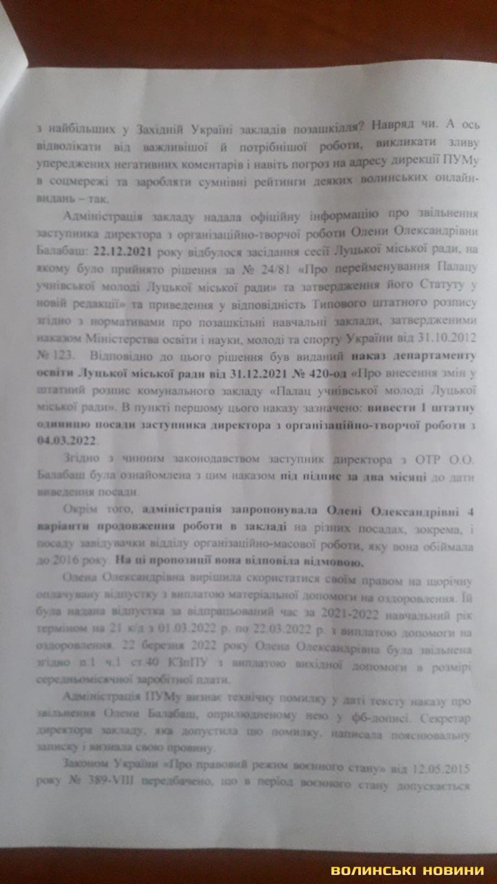 Адміністрація закладу надала офіційну інформацію про звільнення заступника директора з організаційно-творчої роботи Олени Олександрівни Балабаш: 22.12.2021 року відбулося засідання сесії Луцької міської ради, на якому було прийнято рішення за № 24/81 «Про перейменування Палацу учнівської молоді Луцької міської ради» та затвердження його Статуту у новій редакції» та приведення у відповідність Типового штатного розпису згідно з нормативами про позашкільні навчальні заклади, затвердженими наказом Міністерства освіти і науки, молоді та спорту України від 31.10.2012 № 123. Відповідно до цього рішення був виданий наказ департаменту освіти Луцької міської ради від 31.12.2021 № 420-од «Про внесення змін у штатний розпис комунального закладу «Палац учнівської молоді Луцької міської ради». В пункті першому цього наказу зазначено: вивести 1 штатну одиницю посади заступника директора з організаційно-творчої роботи з 04.03.2022.