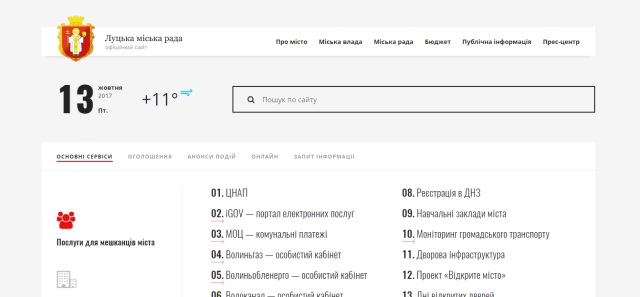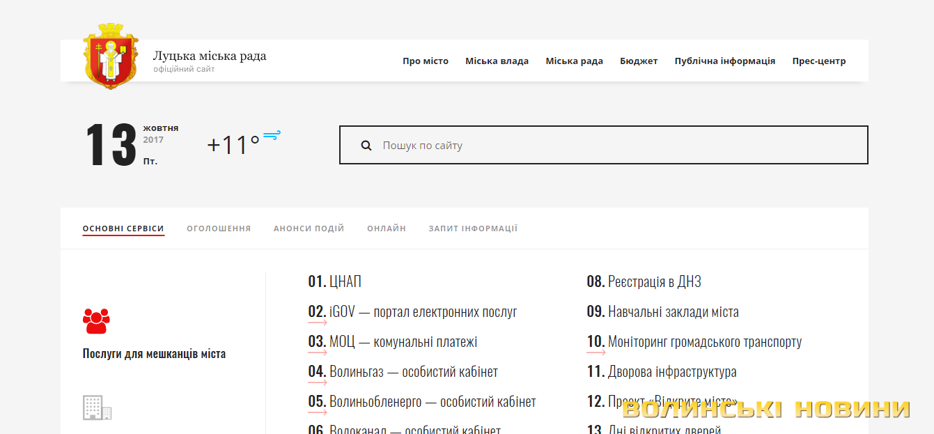 На головній сторінці винесені найголовніші розділи, які можуть цікавити відвідувачів сайту – ЦНАП, комунальні платежі, кабінети «Волиньобленерго» та «Волиньгазу», тобто це будуть посилання на сервіси відповідних структур, аби полегшити пошук. Також тут винесено розділ Реєстрація в навчальних закладах, Моніторинг громадського транспорту – ця інформація може налаштовуватися, змінюватися відповідно до потреб на певні періоди.