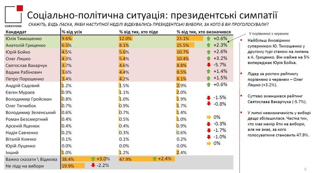Чинного президента Петра Порошенка, якого називали найбільш вірогідним суперником Юлії Тимошенко в другому турі, підтримують 8% українців. Він посідає лише сьоме місце, поступаючись Анатолію Гриценку, Юрію Бойку, Олегу Ляшку, Святославу Вакарчуку та Вадиму Рабіновичу.