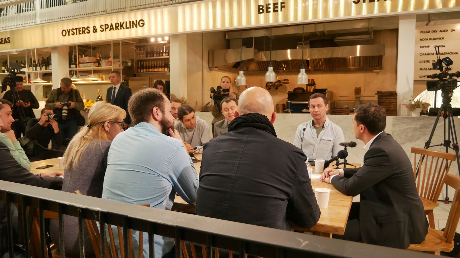 Підхід до марафону був нестандартний – президент цілий робочий день провів на модному київському фудкорті, де практично без перерв на їжу, групами приймав представників ЗМІ за столом.