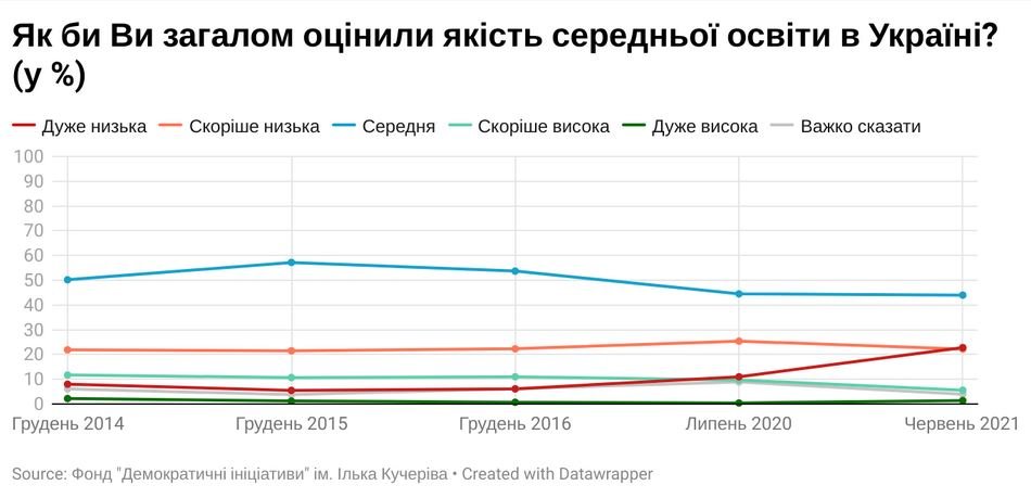 Сорок п’ять відсотків батьків в Україні оцінюють якість середньої освіти як «посередню», майже такий же відсоток – 44% – як «низьку» і «дуже низьку».