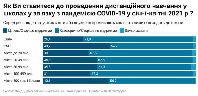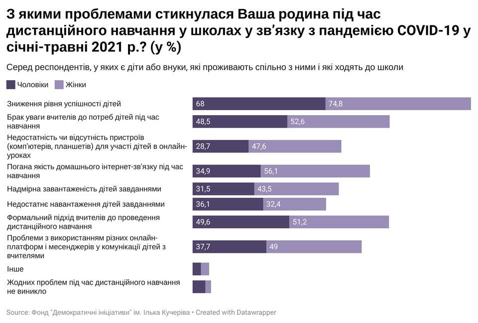 «Перше, що ми запитали: як українці оцінюють якість середньої освіти в Україні. Загалом домінує відповідь «посередньо», це 45%, і якщо об’єднати відповіді «скоріше низька» і «дуже низька» – це буде 44%. За віковим розподілом від 18 до 29 років оцінюють якість освіти набагато позитивніше, ніж люди старшого віку, серед вікової групи 19-29 років 14% оцінюють якість освіти як дуже високу, в той час серед вікової групи 60+ це всього 4%», – сказала Бондаренко.За результатами дослідження, 65% батьків висловилися проти дистанційної освіти. Втім, за словами Бондаренко, 50% батьків вказали на те, що запровадження дистанційної освіти тією чи іншою мірою сприяло захисту їхньої родини від коронавірусної інфекції. Але 56% зазначили, що негативних наслідків від дистанційної освіти було більше, ніж позитивних.72% батьків повідомили про зниження рівня успішності дітей, 51% – про брак уваги вчителів до потреб дітей під час навчання. 50% заявили про формальний підхід вчителів до проведення дистанційного навчання.У селах також повідомляли про недостатнє технічне забезпечення (комп’ютери, планшети) – 53% батьків, в містах (понад 500 тис. населення) про це заявили 20%.