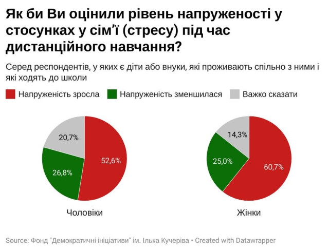 Також опитані відзначали збільшення напруги в сім’ях у зв’язку із запровадженням дистанційної освіти в їхніх дітей – 57% (52% – чоловіки, 60% – жінки).Бондаренко відзначила: попри те, що вакцинація була б виходом із ситуації, лише 33% батьків учнів готові підтримати запровадження вакцинації дітей віком 12-17 років від COVID-19.