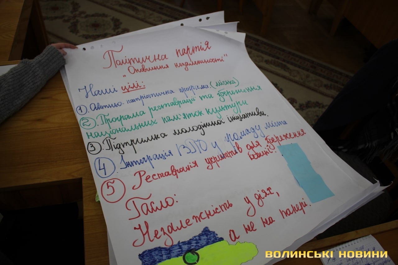 «Сьогодні бачимо заклики до міського голови, щодо роботи «Волиньобленерго», до якого він не має відношення. Бачимо заклики до депутатів місцевих рад щодо збільшення пенсій, що також не в їхній компетенції, і тому подібне. Дуже важливо вчити цьому молодь, аби вони були свідомими громадянами. Чимало студентів уже мають бажання йти в політику. Навіть ті, хто не наважаться, зрозуміють, як змінювати країну, впливати на ті чи інші процеси. Нам важливо мати активну частку громадян у суспільстві, адже тільки завдяки їм змінюється на краще наша країна, громада, наше місто», – наголосила Катерина Шкльода.Після представлення всі присутні голосували за одну із політичних сил. За підсумками першого туру виборів «Любисток» та «Оновлення незалежності» мали однакову кількість балів. Лише після додаткового голосування останні здобули перемогу. Лідер партії, згідно з умовами завдання, ставав імпровізованим міським головою. Наприкінці дійства учасники ділилися враженнями від участі в проєкті «Оновлення 2022. Прокачайся заради майбутнього».