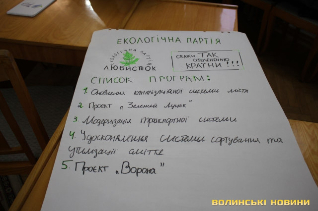 Учасники представили три політсили. Першою була «Демократична цеглина», яка зосередила увагу на проблемах здорового способу життя молоді. «У нас кидають курити в 18 років, коли в Європі в цьому віці лише починають», – жартівливо зауважив лідер Денис Роменець.Далі виступала партія «Оновлення незалежності». Учасники розповіли про важливість патріотичного виховання, збереження історичних пам’яток та інтеграцію переселенців у життя громади.Об’єднання «Любисток» зосередилося на проблемах екології. Окремим пунктом їхньої передвиборчої програми став проєкт «Ворона». Він мав на меті зменшення кількості цих птахів у місті, що викликало тривалу дискусію між групами.Голова правління Фонду Ігоря Палиці «Тільки разом» Катерина Шкльода пояснює, що цим проєктом організатори хотіли розповісти молоді, що таке політика, що таке депутатство. За її словами, чимало людей, навіть дорослих, не розуміють і не розрізняють функції вищих та місцевих органів влади.