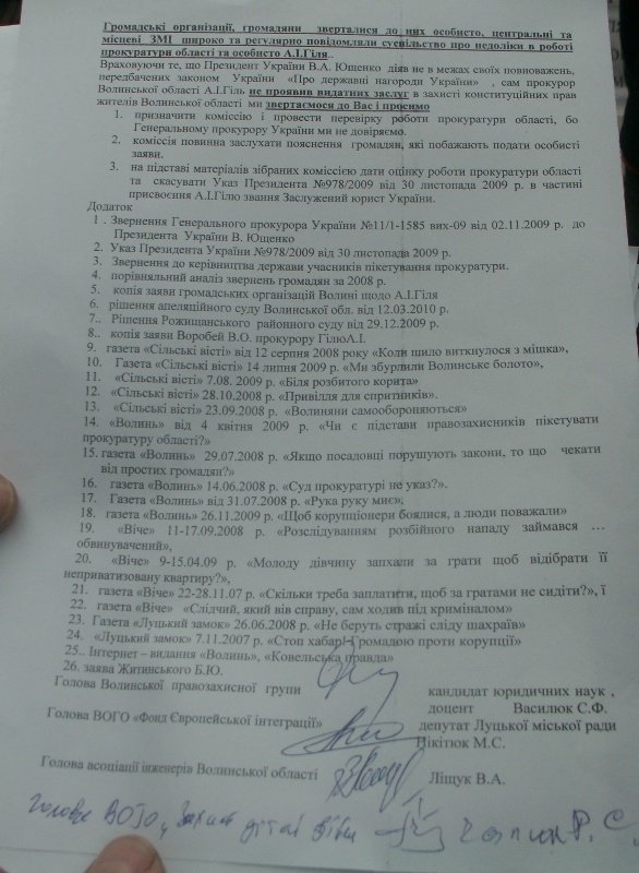 Пікетувальники написали заяву на декількох листках до Президента України Віктора Януковича, в якій вимагають звільнити Гіля. У заяві наведено ряд фактів, публікації в ЗМІ, які порушують питання компетенції прокурора.