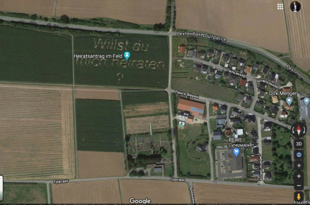32-річний фермер з Німеччини Стефан Шварц вирішив бути креативним і зробити своїй коханій пропозицію руки і серця так, щоб вона точно запам’ятала це на все життя. І чоловікові це вдалося, передає FaceNews.ua. Його жест потрапив на Google Maps і сторінки найбільших видань світу.