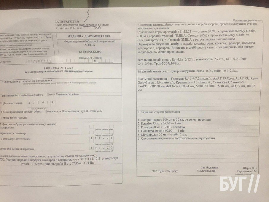 У жительки села Морозовичі Поромівської громади 57-річної Людмили Плясун стався гострий передній інфаркт міокарда, після якого жінку скерували у Волинську обласну клінічну лікарню, де їй призначили операцію на серці, вартість якої складатиме від 70000 гривень.