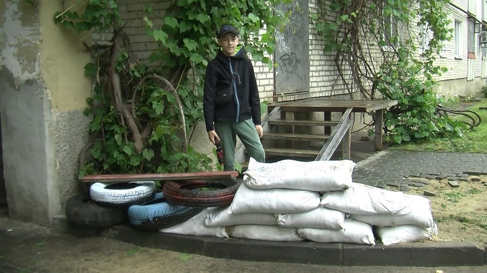 Замість шлагбауму у хлопців дошка, яку вони виставляють перед аркою, коли під’їжджає машина.Брат Микити Фаловського, який також чергує на дитячому блокпосту, зараз захищає Україну від російських військ.