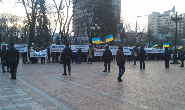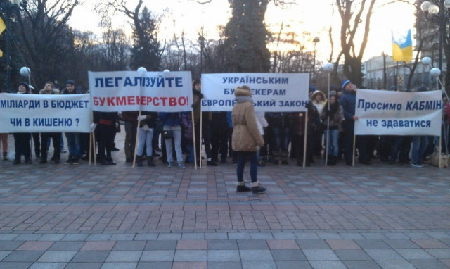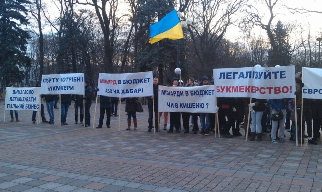 Вони тримають плакати: "Вимагаємо легалізувати гральний бізнес!", "Спорту потрібні букмекери!", "Мільярди в бюджет чи в кишеню?", "Мільярд в бюджет, або на хабарі!".