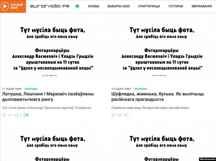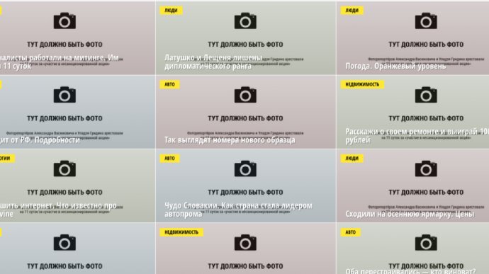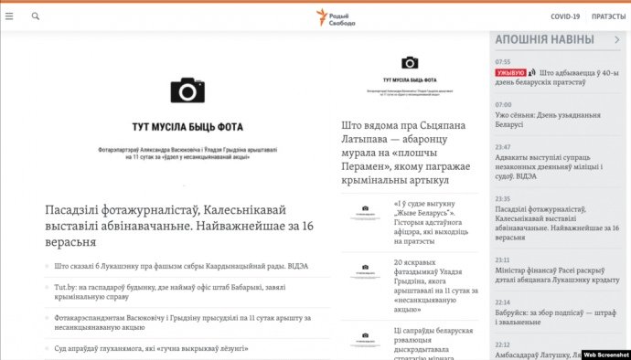 17 вересня головні сторінки незалежних ЗМІ в Білорусі виходять без фотографій на знак солідарності з арештованими напередодні фотокореспондентами.