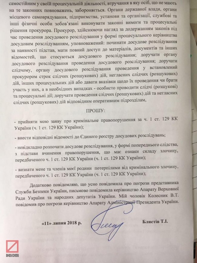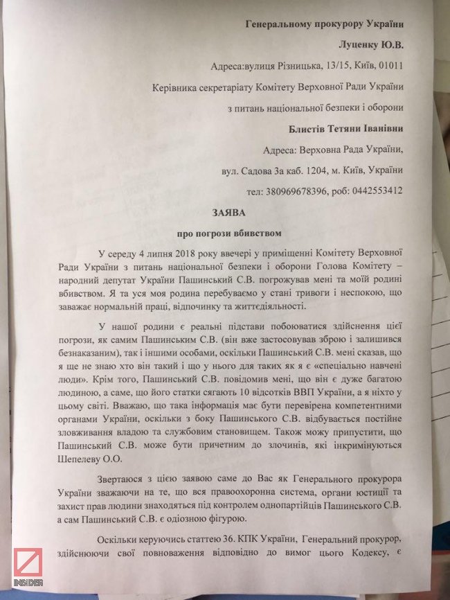"У нашої родини є реальні підстави побоюватися втілення цієї погрози як самим Пашинським, так і іншими особами, оскільки Пашиснький С.В. мені сказав, що я ще не знаю, хто він такий і що в нього для таких, як я, є "спеціально навчені люди". Крім того, Пашинський С.В повідомив мені, що він є дуже багатою людиною, а саме, що його статки складають10% ВВП Україні, а я ніхто у цьому світі", - написала Блистів.