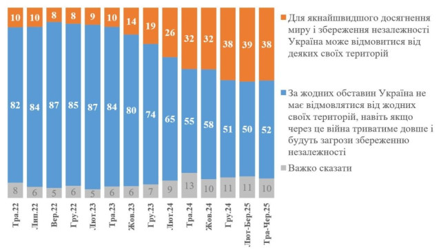 Згідно з дослідженням, порівняно з лютим 2025 року ситуація не змінилася. Так, 52% українців категорично проти жодних територіальних поступок (у лютому 2025 року – 50%).