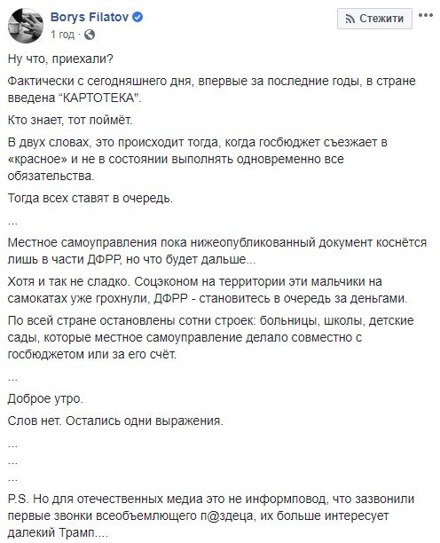 «Хоча й так не солодко. Соцеконом на території ці хлопчики на самокатах вже грохнули, ДФРР – ставайте в чергу за грошима. По всій країні зупинено сотні будівництв: лікарні, школи, дитячі садочки, які місцеве самоврядування робило спільно з держбюджетом або за його рахунок. Доброго ранку. Слів немає. Залишилися одні висловлювання. Але для вітчизняних медіа це не інформпривід, що залунали перші дзвінки всеосяжного п@здецю, їх більше цікавить далекий Трамп», – резюмував Філатов.