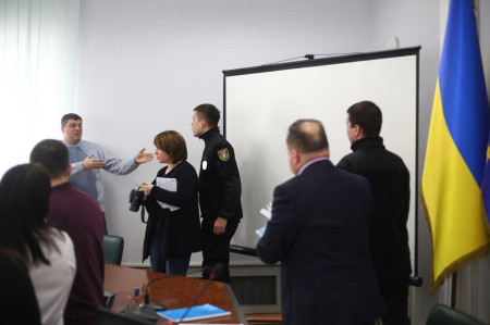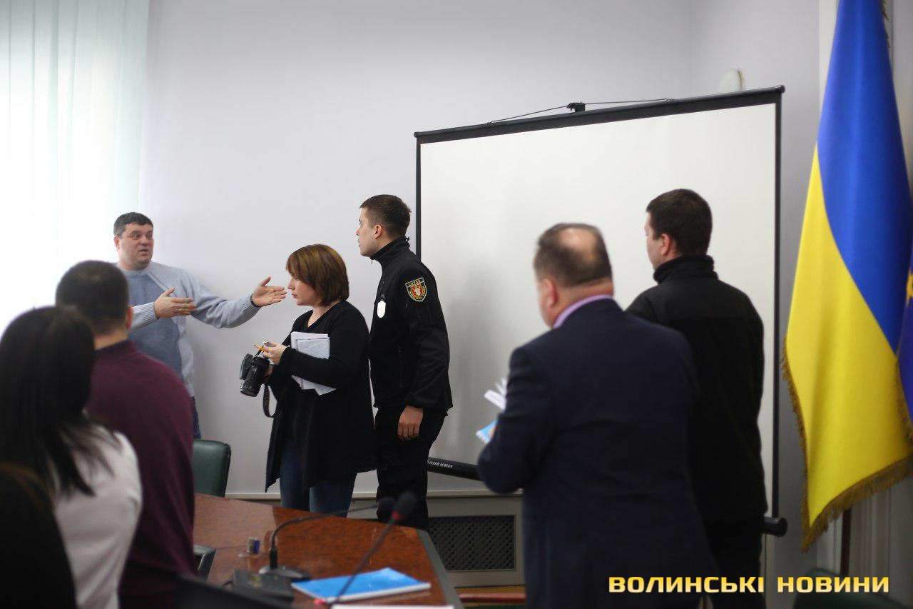 Самооборонівець Сергій Рижков, який раніше зірвав одне із засідань Луцької міської ради, спробував сьогодні з «групою підтримки» заблокувати трибуну. Грубо порушуючи регламент, він відмовився покинути сесійну залу, в якій не має права знаходитися, та всіляко перешкоджав слуханню.