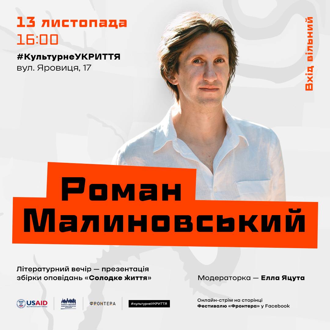 У неділю, 13 листопада, о 16:00 в Культурному УКРИТТІ (вул. Яровиця, 17) відбудеться літературний вечір – презентація збірки оповідань українського прозаїка Романа Малиновського.