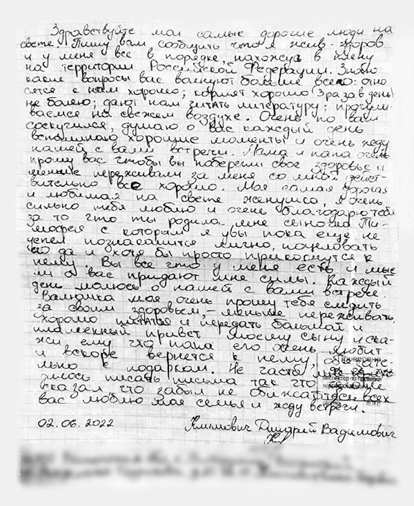 29 серпня родина отримала першу звістку від Дмитра – листа. Його він написав ще 2 червня. Валентина тоді довго порівнювала кожну букву зі старими Дмитровими прописами – чи дійсно листа писав він? Адже Дмитро не дуже знав російську і ніколи нею нічого не писав. Почерк трохи відрізнявся від його «до полону», але лист точно був написаний рукою її чоловіка. Ймовірно, листа Дмитро писав під диктовку і цензор не лише перевіряв написане, а й контролював сам процес.Пів року Валентина не розповідала про полон чоловіка. Її запевнили, що це може йому нашкодити, адже він офіцер. Але тепер жінка вирішила розповісти, щоб не тільки вона знала про те, що її чоловік у полоні.