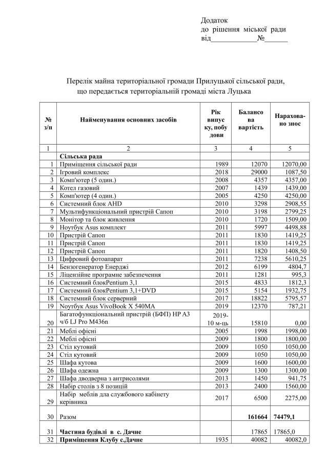 Територіальна громада міста Луцька надала згоду на прийняття у власність майна територіальної громади Прилуцької сільської ради.