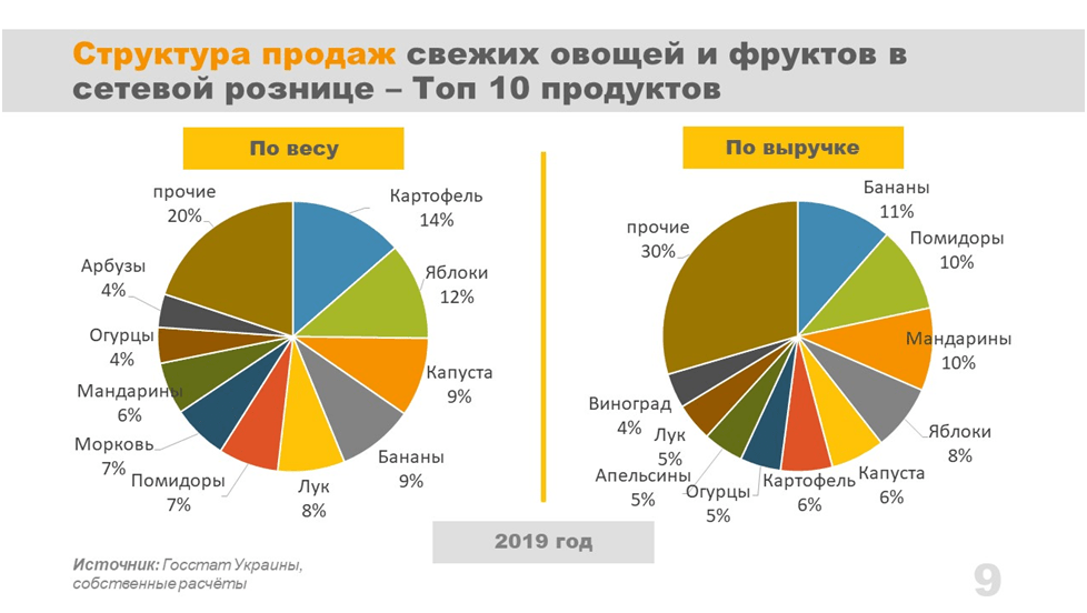 «Ми відібрали 20 основних продуктів за обсягами реалізації у вартісному та натуральному вираженні. По кожному з них склали баланс, враховуючи внутрішнє виробництво, імпорт, експорт, споживання, втрати тощо. Також ми оцінили, яка частина кожного продукту потрапляє на роздріб та частку в продажах», – каже експерт плодоовочевого ринку та міжнародний консультант ФАО Федір Рибалко.