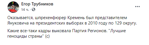 «За всіма ознаками пес, крім вірності».Журналістка Олеся Медведєва назвала Кременя «принциповим хлопцем до остраху».«Які все-таки кадри виробила Партія регіонів». Кращі геноциди країни», – написав блогер Єгор Трубніков.