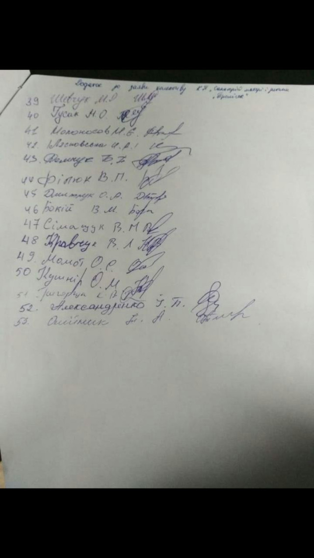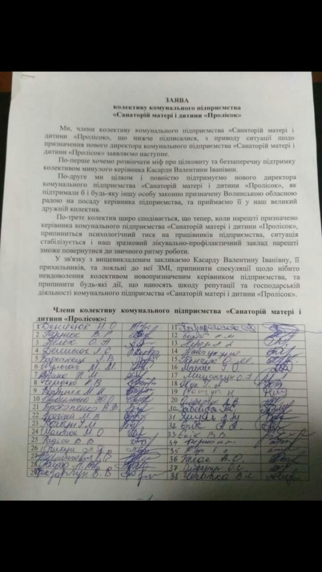 Колектив санаторію матері і дитини «Пролісок» звернувся до екс-керівниці здравниці Валентини Касарди з вимогою припинити спекуляції в ЗМІ, тиск на працівників та псування репутації закладу. Колектив стверджує, що працівники підтримують новопризначену директорку та готові працювати далі.