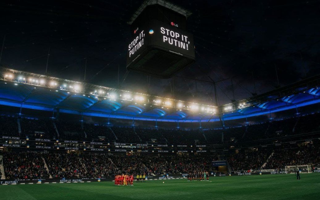 Перед стартом матчу відбулася акція на підтримку України. «Припини це, Путін», – було написано на табло стадіону, повідомляє ТСН.