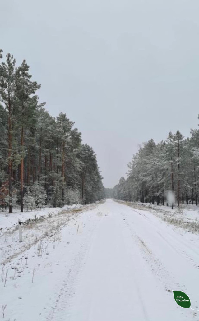 Тим часом волиняни тішаться першому снігу, який добряче притрусив землю та дахи.На фото – лісова дорога в Шацькому лісництві філії «Любомльське лісове господарство».