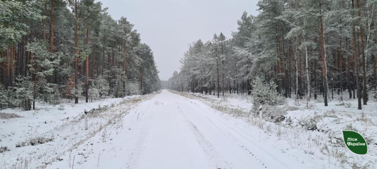Тим часом волиняни тішаться першому снігу, який добряче притрусив землю та дахи.На фото – лісова дорога в Шацькому лісництві філії «Любомльське лісове господарство».