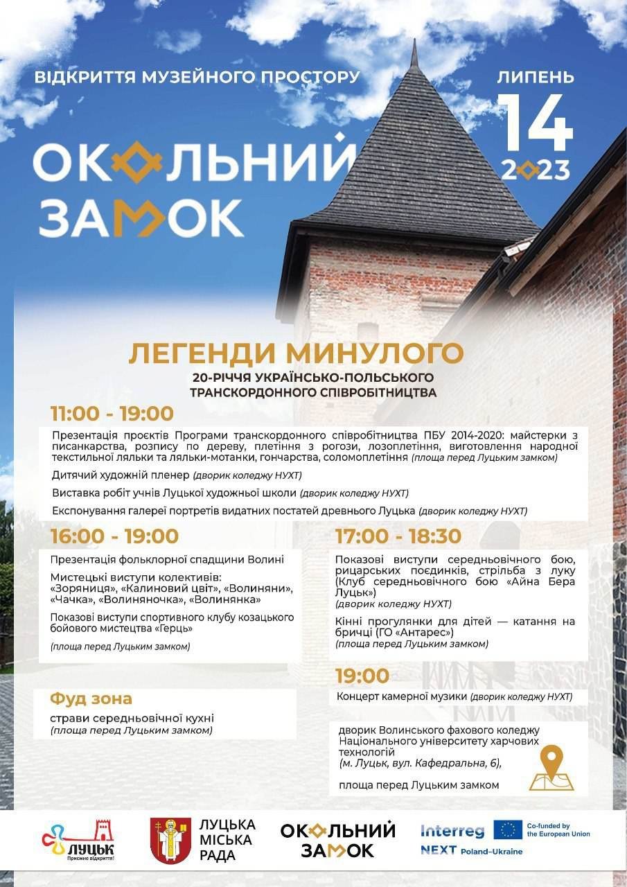 «Відкриватимемо відреставровані підземелля та єдину збережену вежу Окольного замку. Там облаштовано музейний простір «Окольний замок». Відвідувачі зможуть побачити підземні кімнати й галереї віком понад 500 років. На них чекатимуть привид, древній монах, віртуальна подорож у Середньовіччя та багато-багато інших цікавинок», – анонсував Дмитро Зінько.