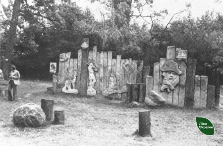 Стела – цілком в стилі Миколи Голованя. Зроблена з поєднанням дерева та каменю. З містичними зображеннями, як і належить героям «Лісової пісні».