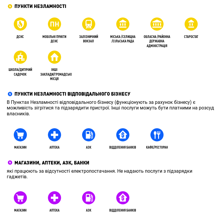 пункти незламності відповідального бізнесу, де є можливість безкоштовно підзарядити гаджети;