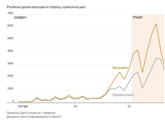Згідно з аналізом Центру інформаційної стійкості, у липні, який став піковим місяцем для безпілотних бомбардувань, Росія запустила по Україні майже 6300 ударних дронів. Для порівняння, у липні 2024 року було запущено 426 таких безпілотників.