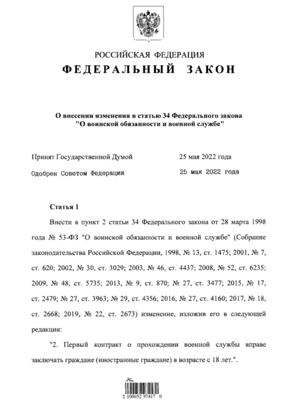 Закон виключає вікову межу для громадян працездатного віку (іноземних громадян), при якому їм надається право укладати перший контракт про проходження військової служби.Раніше контракт могли укладати російські громадяни віком від 18 до 40 років та іноземці віком від 18 до 30 років.