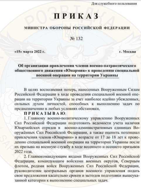 «Вище воєнне керівництво РФ має надати пропозиції щодо проведення підготовки зазначеного особового складу в найкоротші терміни. Контроль за виконанням наказу покладено на начальника головного військово-політичного управління ЗС РФ Геннадія Жидка», – інформує розвідка.Зазначають, що «Юнармія» – російська дитячо-юнацька мілітарна організація при Міністерстві оборони РФ. Вирізняється радикальною пропагандистською роботою серед російської молоді. Членами організації стають діти з 8 років.