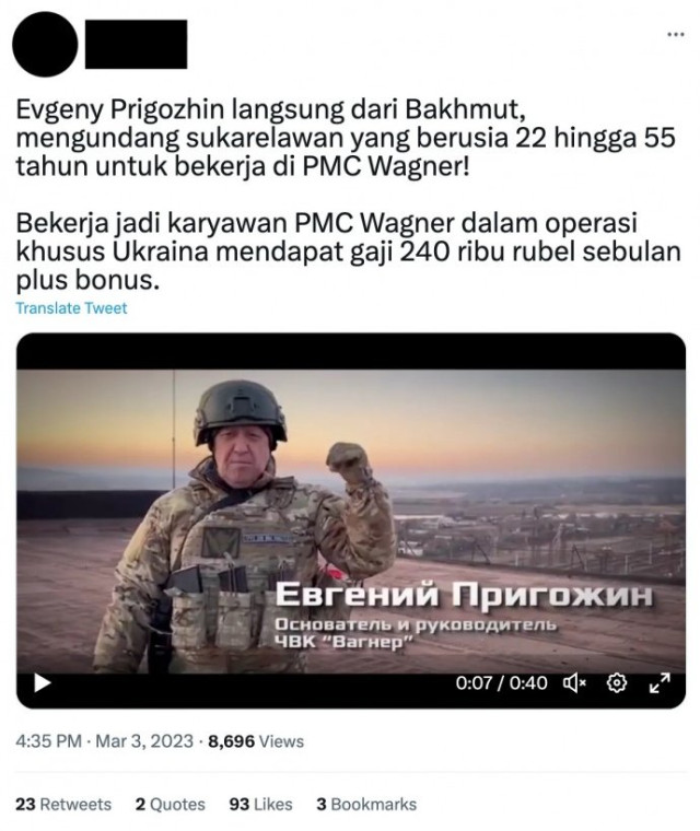 За даними британської групи Logically, що досліджує дезінформацію, оголошення про вакансії в компанії Wagner, найманці якої діють у кількох країнах, за останні 10 місяців набрали майже 120 тисяч переглядів у двох соцмережах.